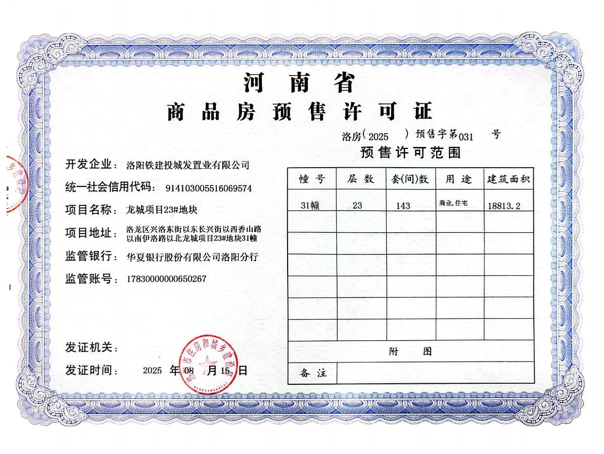 8月15日,鐵建投城發(fā)·龍城項(xiàng)目23#地塊31#樓順利獲取《商品房預(yù)售許可證》,較原計(jì)劃提前45天完成,盡顯一流“城發(fā)速度”,為下半年銷售沖刺提供堅(jiān)實(shí)保障。下一步,洛陽公司將錨定目標(biāo)、堅(jiān)定信心,全力打贏回款攻堅(jiān)戰(zhàn),為集團(tuán)高質(zhì)量發(fā)展再添助力。